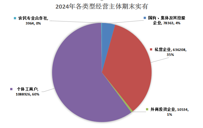 截至2024年底,全市经营主体存量总数1817995户,较2023年底增长1.02%,其中企业725105户,增长3.55%(外商投资企业10534户,增长0.79%),个体工商户1088926户,下降0.58%,农民专业合作社3964户,下降2.12%。