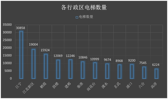 南京市12个行政区在用电梯分布情况如下,其中江宁区电梯数量最多30858台;高淳区电梯数量最少6224台。