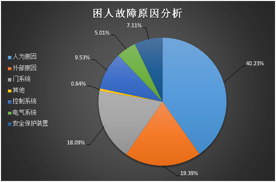依据《电梯应急处置平台技术规范》(CPASE M001—2019),在人为原因、外部原因、门系统、曳引系统、导向系统、轿厢、控制系统、电气系统、安全保护装置九类故障中:人为原因故障(249起,占40.23%)、外部原因故障(120起,占19.39%)、门系统故障(112起,占18.09%)居前三位,其中生活(装修)垃圾导致开关门受阻困人217起、停电困人65起、门锁失效77起。