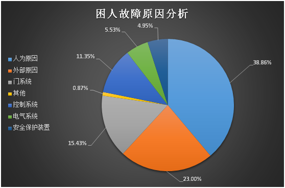 依据《电梯应急处置平台技术规范》(CPASE M001—2019),在人为原因、外部原因、门系统、曳引系统、导向系统、轿厢、控制系统、电气系统、安全保护装置九类故障中:人为原因故障(267起,占38.86%)、外部原因故障(158起,占23.0%)、门系统故障(106起,占15.43%)居前三位,其中生活(装修)垃圾导致开关门受阻困人230起、停电困人81起、门锁失效63起。