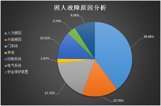 依据《电梯应急处置平台技术规范》(CPASE M001—2019),在人为原因、外部原因、门系统、曳引系统、导向系统、轿厢、控制系统、电气系统、安全保护装置九类故障中:人为原因故障(203起,占39.96%)、门系统故障(90起,占17.72%)、外部原因故障(79起,占15.55%)居前三位,其中生活(装修)垃圾导致开关门受阻困人168起、停电困人33起、门锁失效59起。
