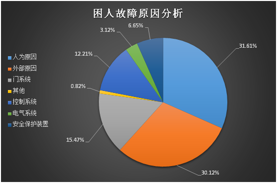 依据《电梯应急处置平台技术规范》(CPASE M001—2019),在人为原因、外部原因、门系统、曳引系统、导向系统、轿厢、控制系统、电气系统、安全保护装置九类故障中:人为原因故障(233起,占31.61%)、外部原因故障(222起,占30.12%)、门系统故障(114起,占15.47%)居前三位,其中生活(装修)垃圾导致开关门受阻困人195起、停电困人89起、门锁失效71起。